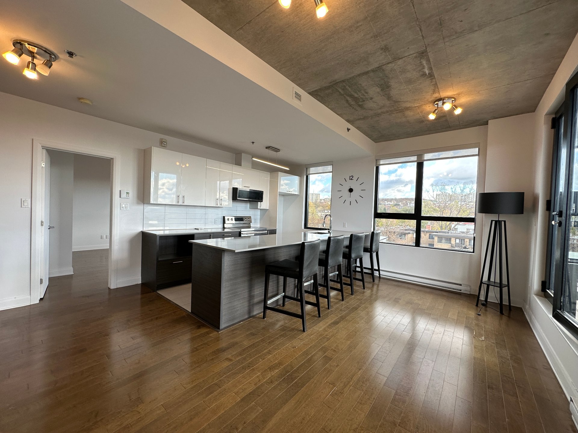 béton hauts, de grandes fenêtres et un espace de vie à aire